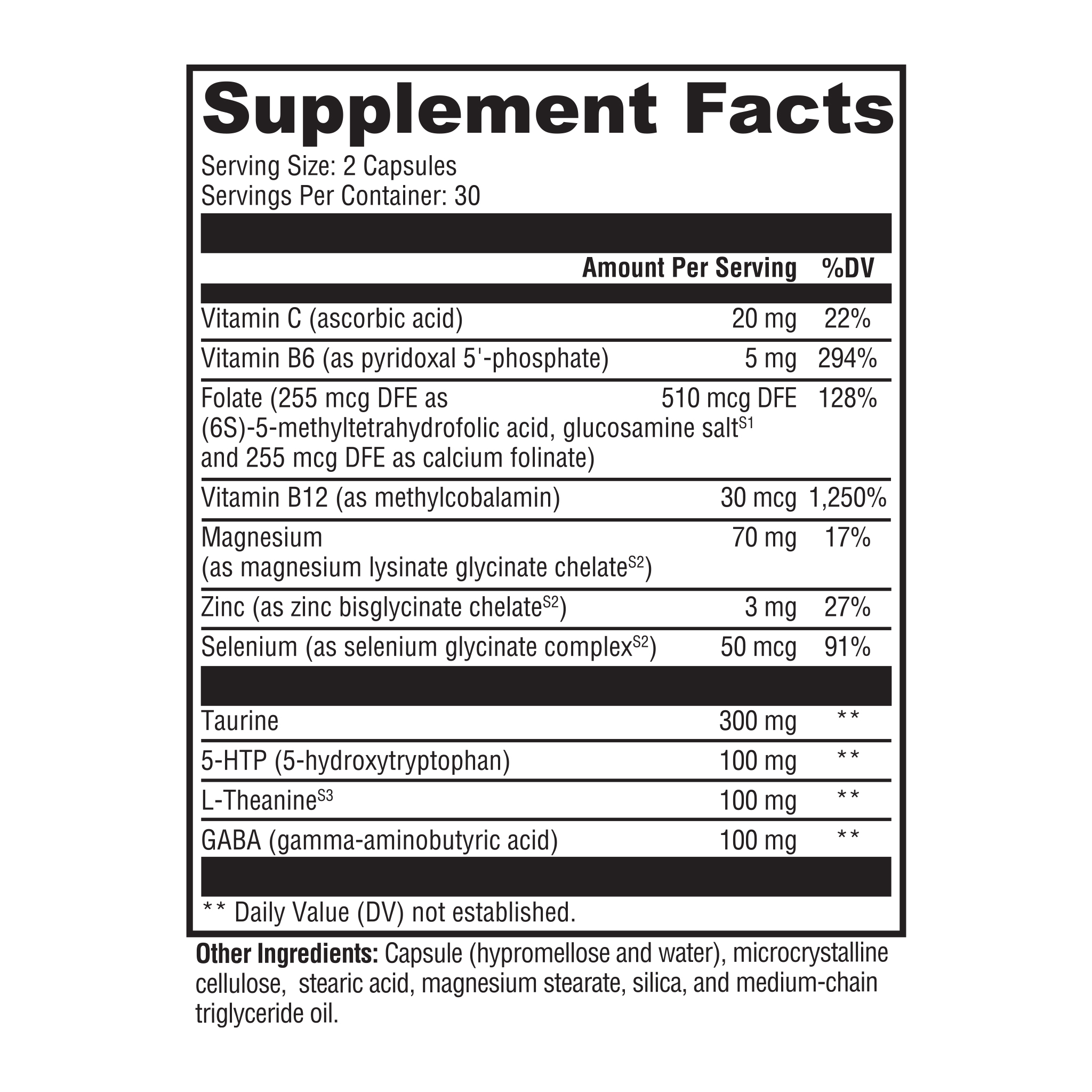 Mood Synergy™ provides key nutrients involved in the methylation pathway, such as selenomethionine; vitamin B6 as pyridoxal 5’-phosphate; vitamin B12 as the readily bioavailable form, methylcobalamin; and folate as bioactive Quatrefolic® (5-MTHF glucosamine salt) and calcium folinate.[1] Pyridoxine nutritional status selectively modulates central production of serotonin and GABA (gamma-aminobutyric acid)—neurotransmitters that are involved in physical pain perception and mental wellness.*[2]